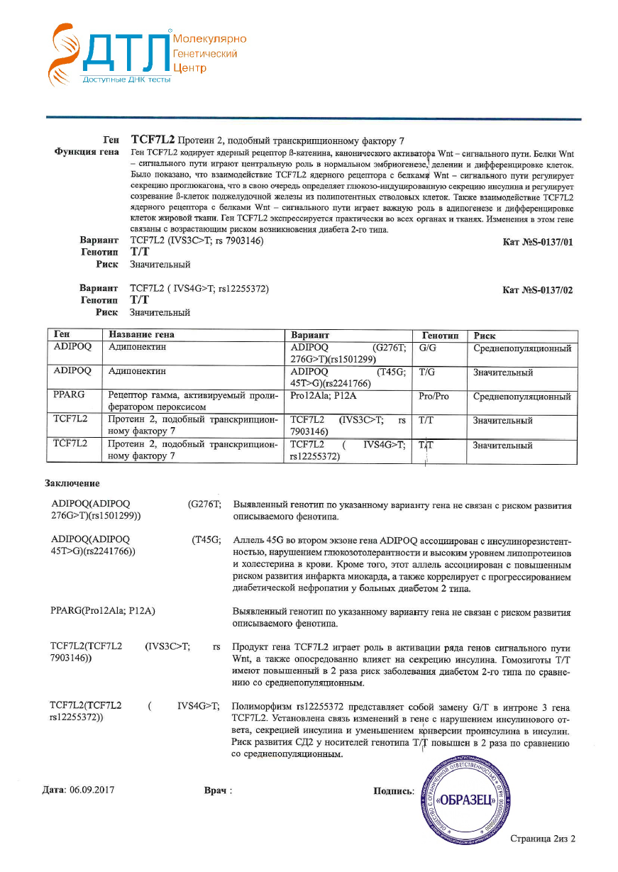 - TCF7L2 — кодирует ядерный рецептор b-катенина, участвует в активации сигнального пути Wnt. Взаимодействие белков сигнального пути Wnt и ядерного рецептор регулирует образование ß-клеток поджелудочной железы. Именно эти клетки вырабатывают инсулин. При наличии двух мутантных аллелей (гомозигота) у человека в 2 раза увеличивается риск развития сахарного типа 2 типа. При наличии одного мутантного гена (гетерозигота) риск увеличен в 1.5 раза по отношению к среднепопуляционному.