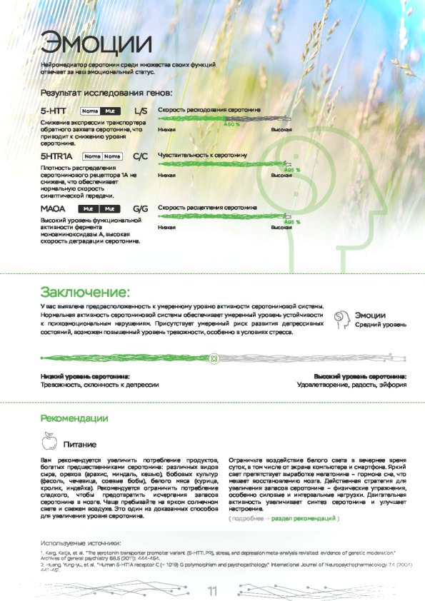 Эмоции и психические состояния регулируются нейромедиаторами — особыми химическими соединениями, они регулируют передачу электрохимического импульса между нейронами, а также между мозгом и мышцами. Интенсивность работы нейромедиаторов определяется генами. Проанализировав определенные гены можно повысить эффективность работы, самочувствие и снизить уровень стресса.